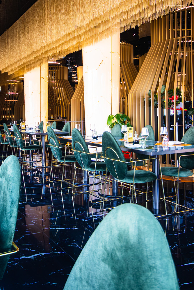 La base è composta d terra dolce. alghe croccanti, gambero rosso, mango, cipolla viola, prezzemolo, fruit passion con salsa mango, crema di avocado e prosciutto essiccato.